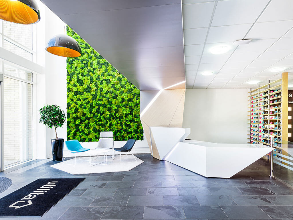 The addition of high gloss wood panelling and a huge moss wall softened the contemporary area, welcoming those who stepped into the building.