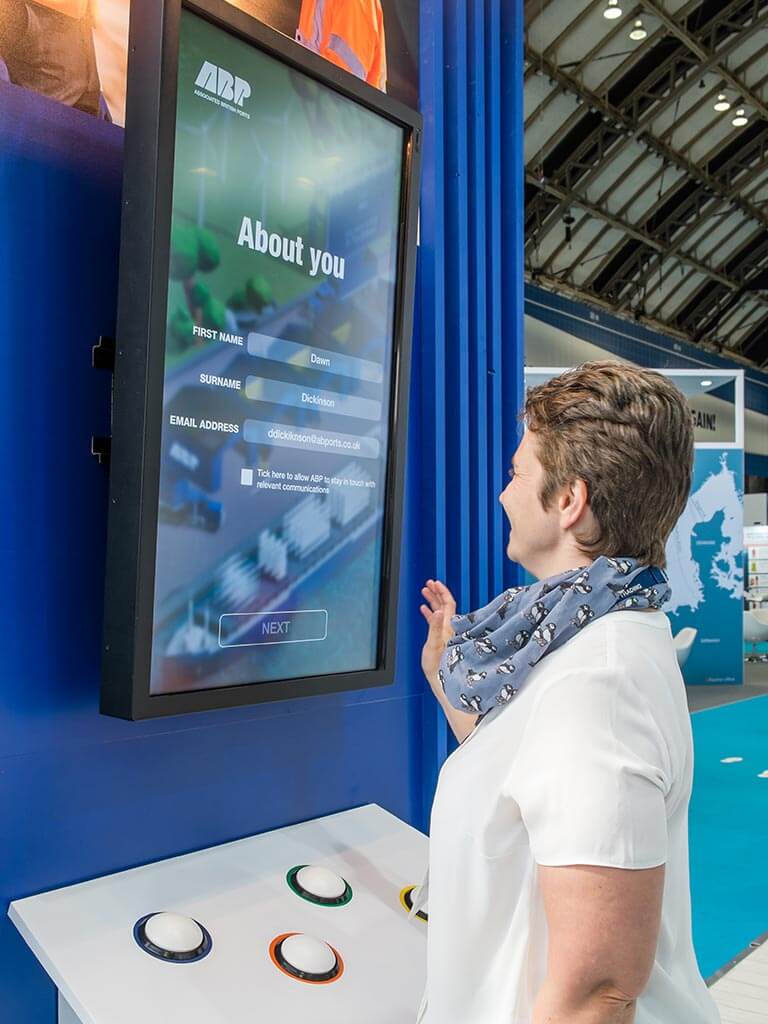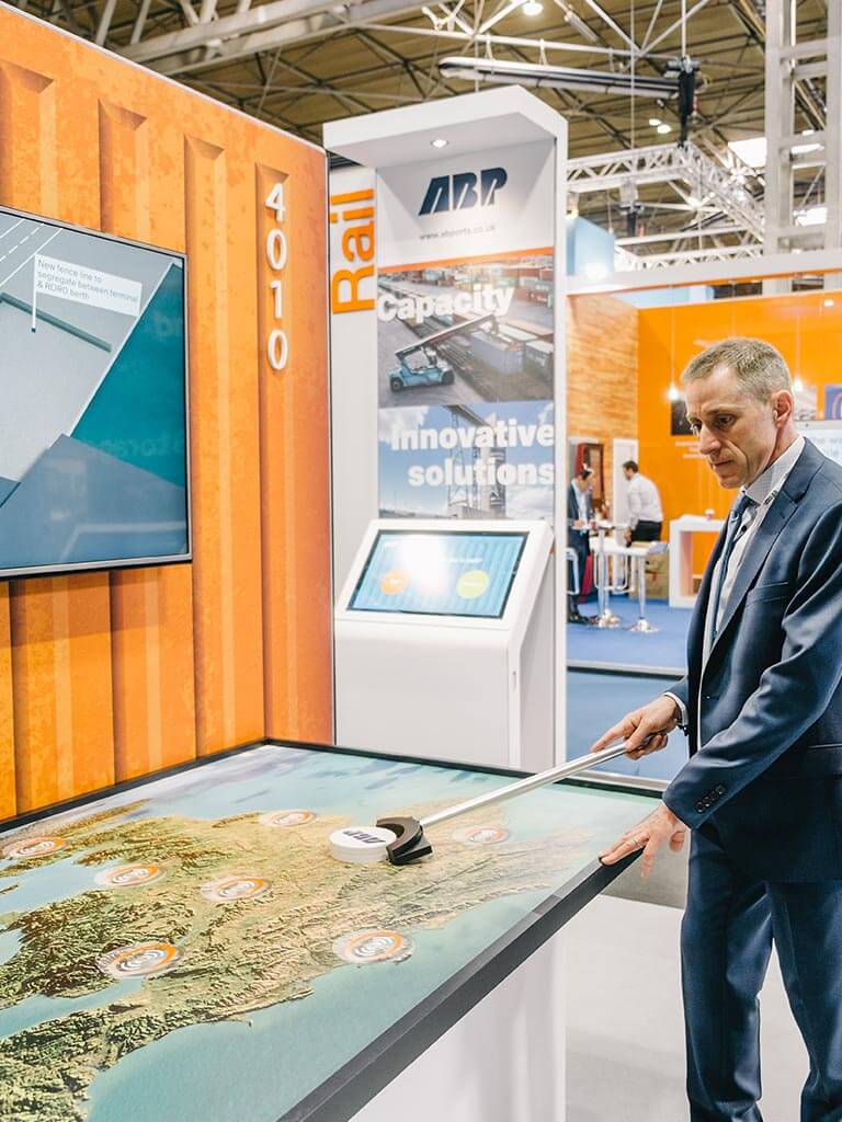 For Multimodal, Nimlok designed a 6m high container with lightboxes on each end to attract attention of visitors from across the hall. Three media centres were installed with company literature and data capture to showcase the three business areas. ABP also used their training partners simulator as an additional interactive touchpoint.