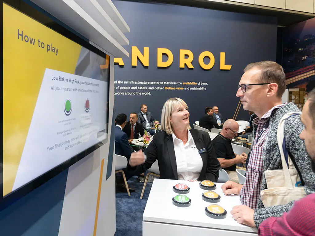 To further engage visitors, a Pandrol-branded interactive bespoke quiz was utilized. Delegates had the option to route their train into a high or low-risk area and were then presented with a question related to the rail industry. This informative engagement tool educated visitors while allowing them to increase their journey time, resulting in a better gaming score and increased dwell time on the stand.