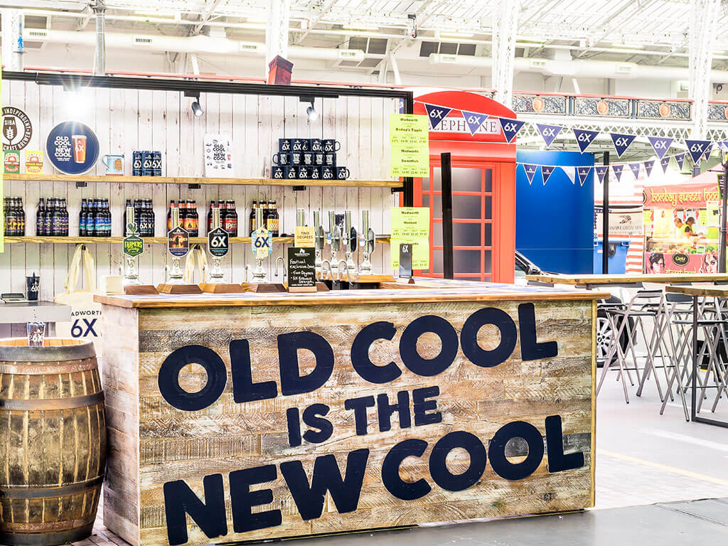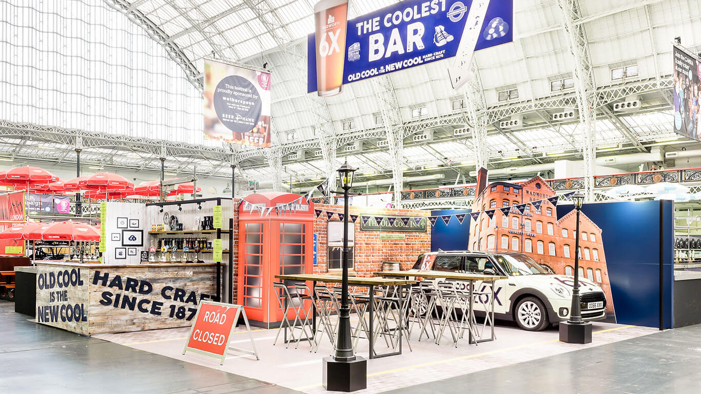 To attract visitors to the stand we created a large hanging banner pointing to ‘The Coolest Bar’ at the show directing visitors to the mock street party we had set up using the Wadworth factory building as a backdrop. The street party came complete with lamp posts, a 6X bar for visitors to sample the product, street signs and the Wadworth & Co. branded Mini.