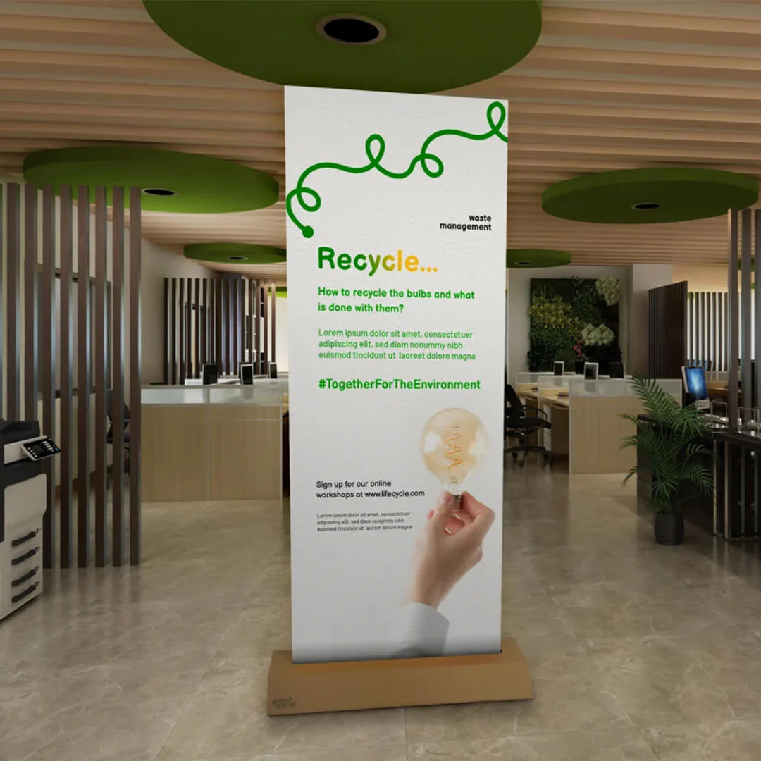 Discover a lightweight and portable option with our Recyclable Roller Banner. It’s an eco-conscious choice compared to traditional aluminium roll-up banners. Ideal for pop-up events, trade shows, and retail displays, this banner helps you lower your carbon footprint while maintaining high quality.